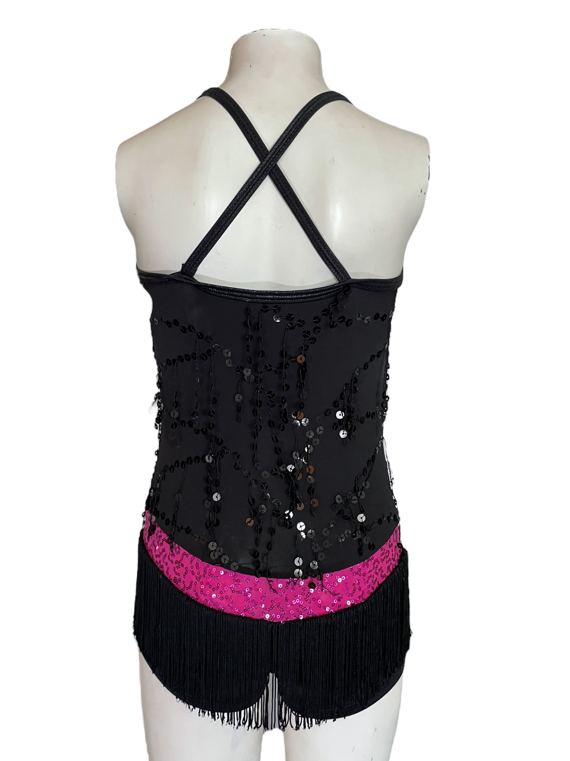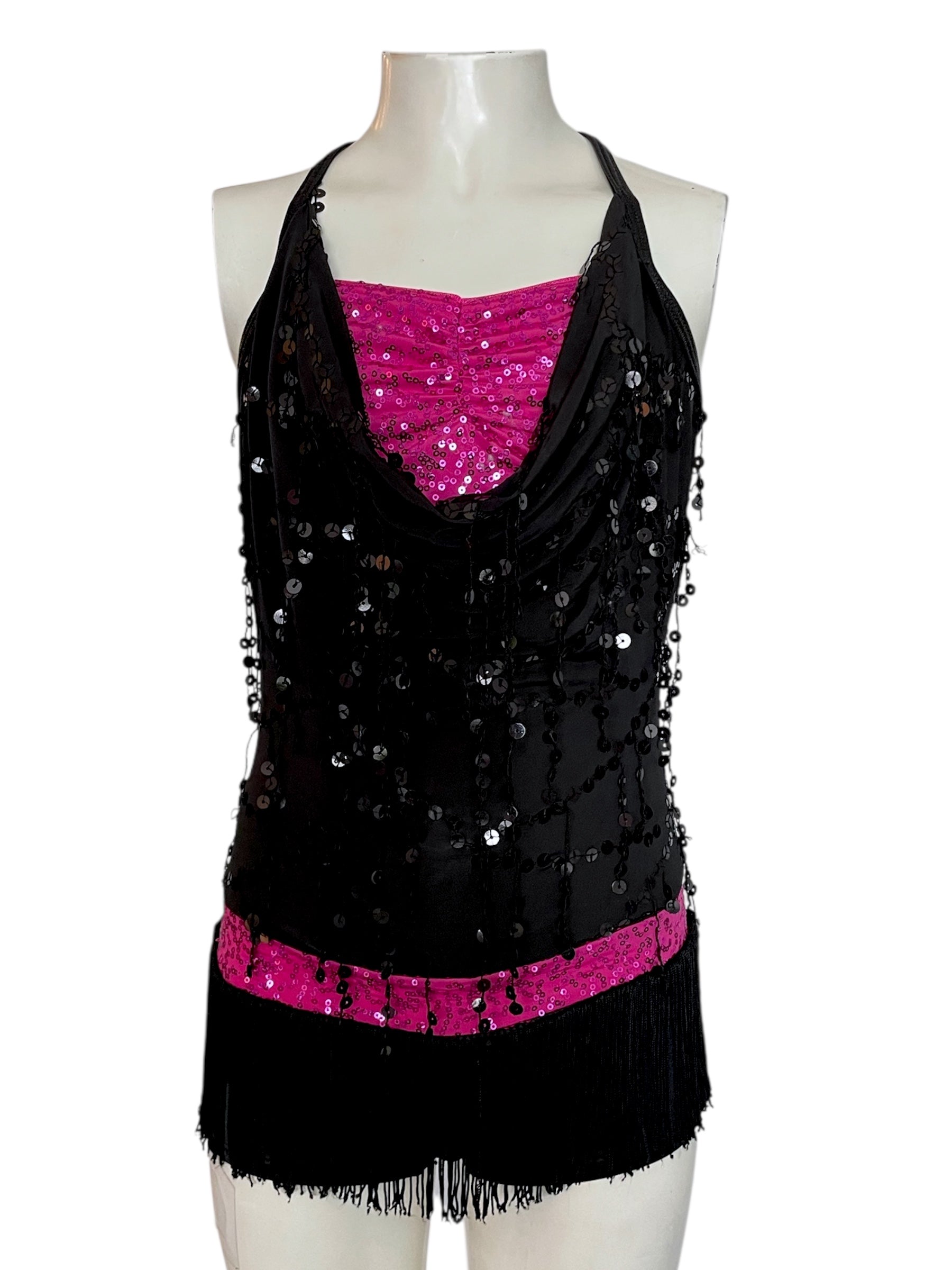 -Cowl draped biketard with sequin fringe on the bodice and regular fringe on shorts