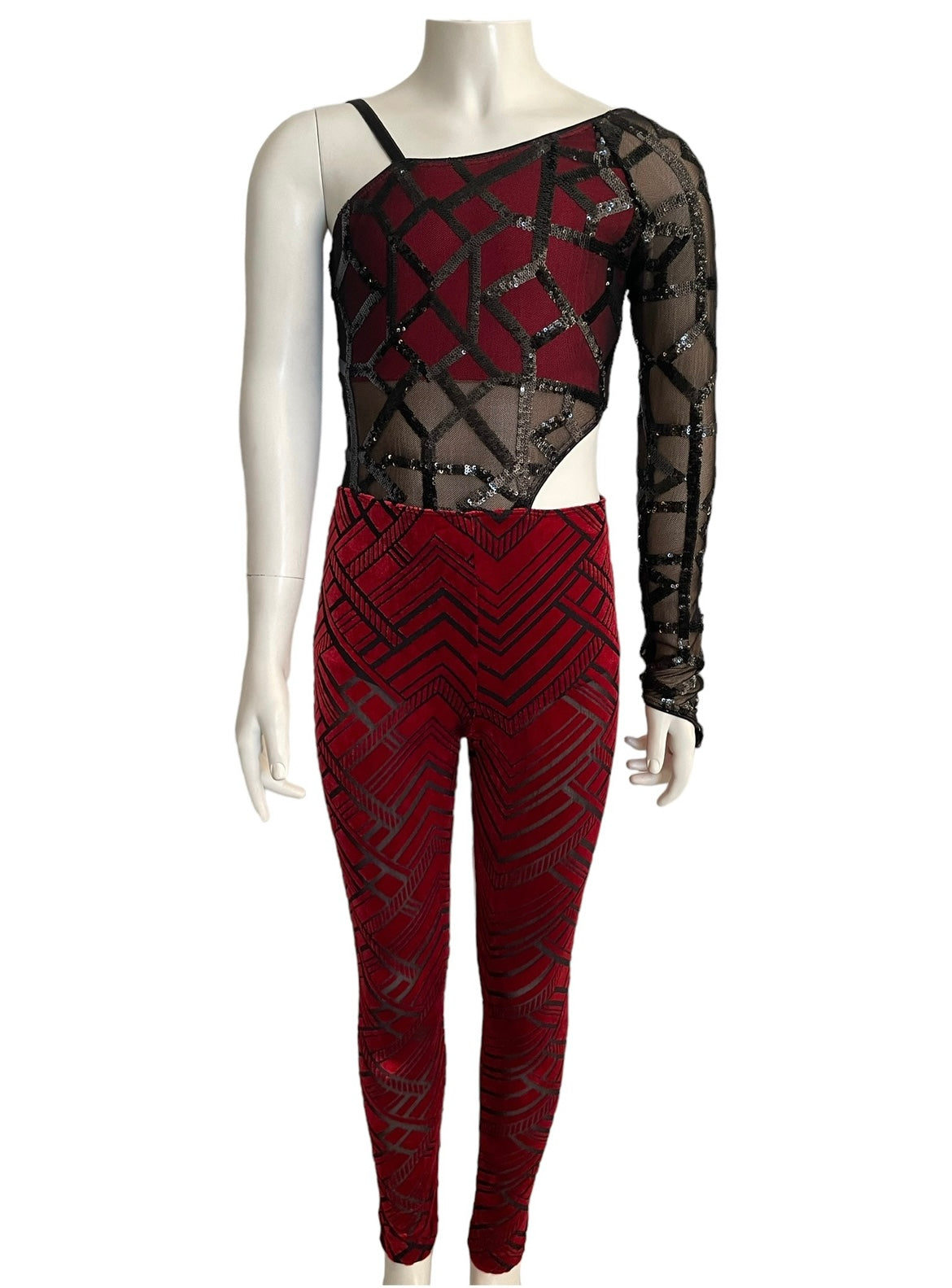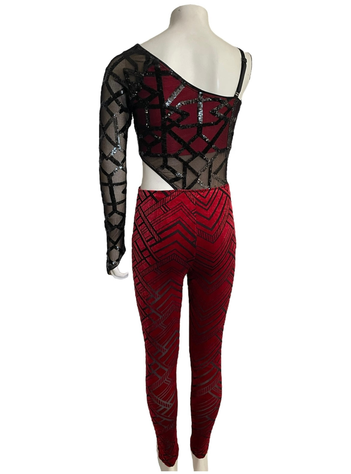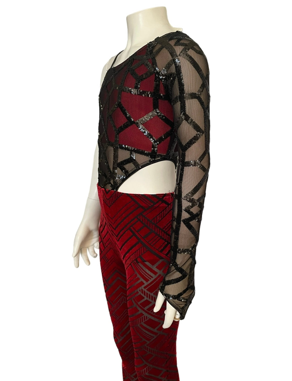 -Sequin stretch mesh and burnout stretch velvet unitard