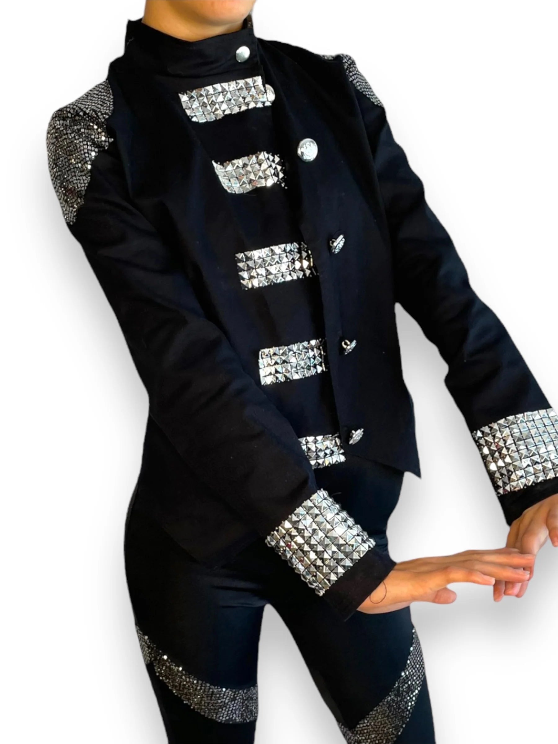 -Moto jacket is made of woven twill with disco insets at the shoulders