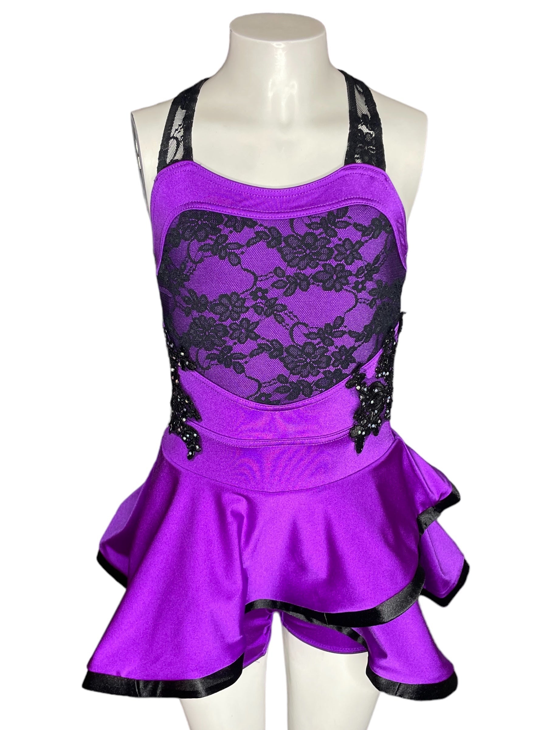 -This shiny spandex biketard has an open floral stretch overlay on the bodice